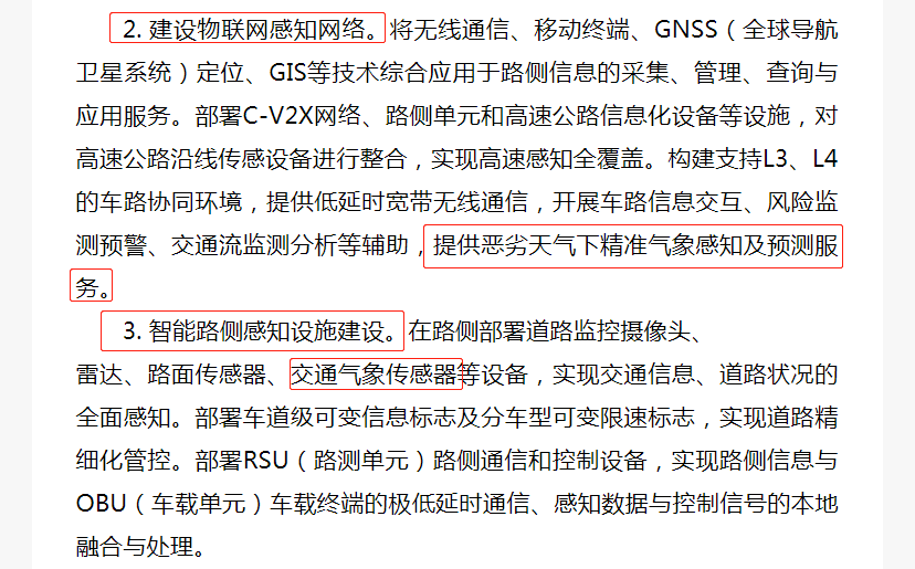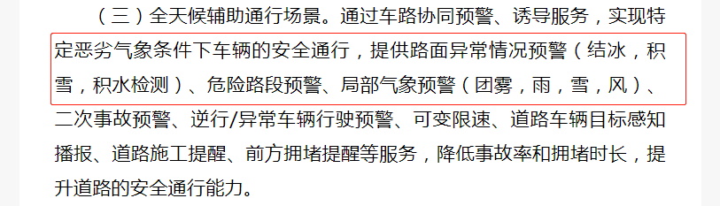 主要內(nèi)容中指出,要建設(shè)物聯(lián)網(wǎng)感知網(wǎng)絡(luò)與智能路側(cè)感知設(shè)施(如交通氣象傳感器、路面?zhèn)鞲衅鳎峁毫犹鞖庀職庀蟾兄邦A(yù)測(cè)服務(wù),提供路面異常情況預(yù)警(結(jié)冰,積雪,積水檢測(cè))、危險(xiǎn)路段預(yù)警、局部氣象預(yù)警(團(tuán)霧,雨,雪,風(fēng))、二次事故預(yù)警、逆行/異常車(chē)輛行駛預(yù)警、可變限速、道路車(chē)輛目標(biāo)感知播報(bào)、道路施工提醒、前方擁堵提醒等服務(wù),降低事故率和擁堵時(shí)長(zhǎng),實(shí)現(xiàn)交通信息、道路狀況的全面感知,提升道路的安全通行能力。